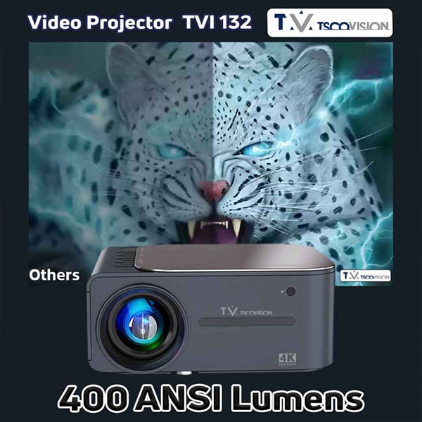 ویدئو پروژکتور تسکوویژن مدل TVI 132 با رزولوشن 1920×1080 (Full HD) و قابلیت پشتیبانی از محتوای 4K، تصاویری با جزئیات دقیق و شفافیت بالا ارائه میدهد. بهعلاوه، این ویژگی آن را برای نمایش محتواهای گرافیکی یا فیلمهای سینمایی ایدهآل کرده است.
